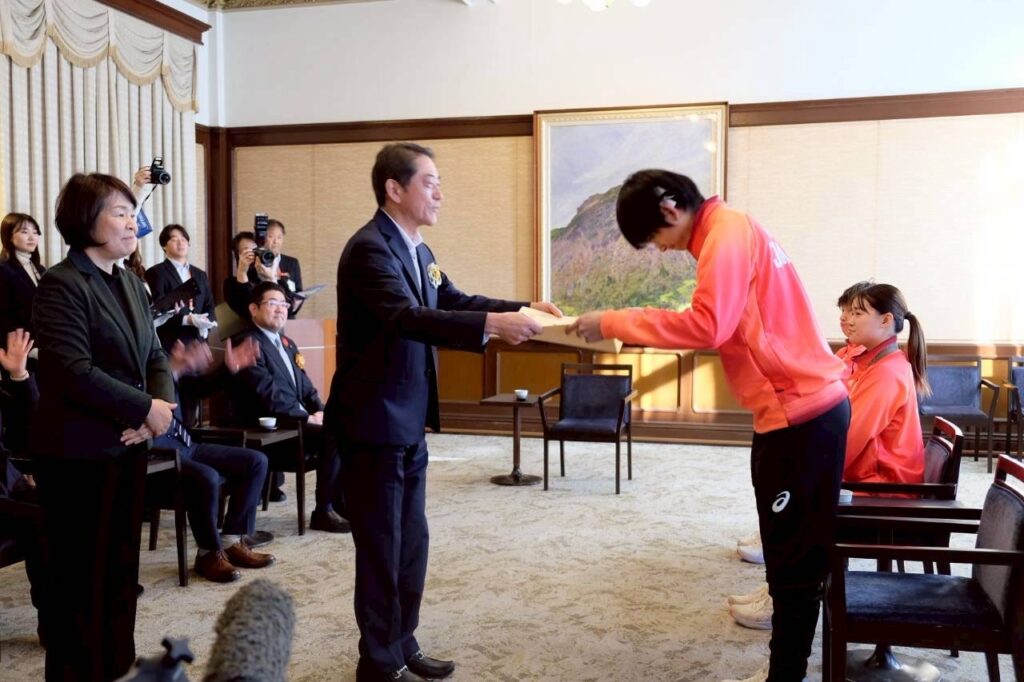 中村時広知事へ大会の成績や今後の目標について報告を行いました。